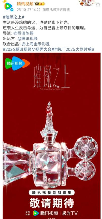 前不久,鹅公布2026大剧片单,《璀璨之上》确定开拍,立即获得网友们的关注,看到这样的情况,很多网友都忍不住问:发生什么事情了?为什么这部剧自带关注度,原来,《璀璨之上》是《许我耀眼》的姊妹篇。